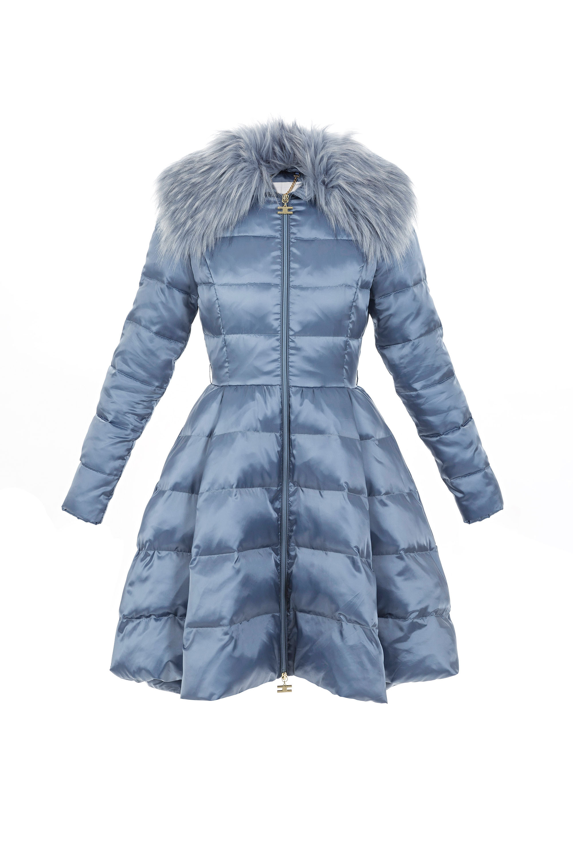 Sotto due abiti per occasioni speciali ed un piumino lungo stretto in vita e svasato, disponibile anche in cipria